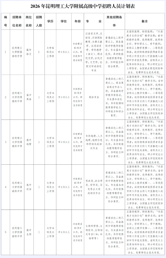 昆明理工大學(xué)附屬高級(jí)中學(xué)2026年教師招聘公告