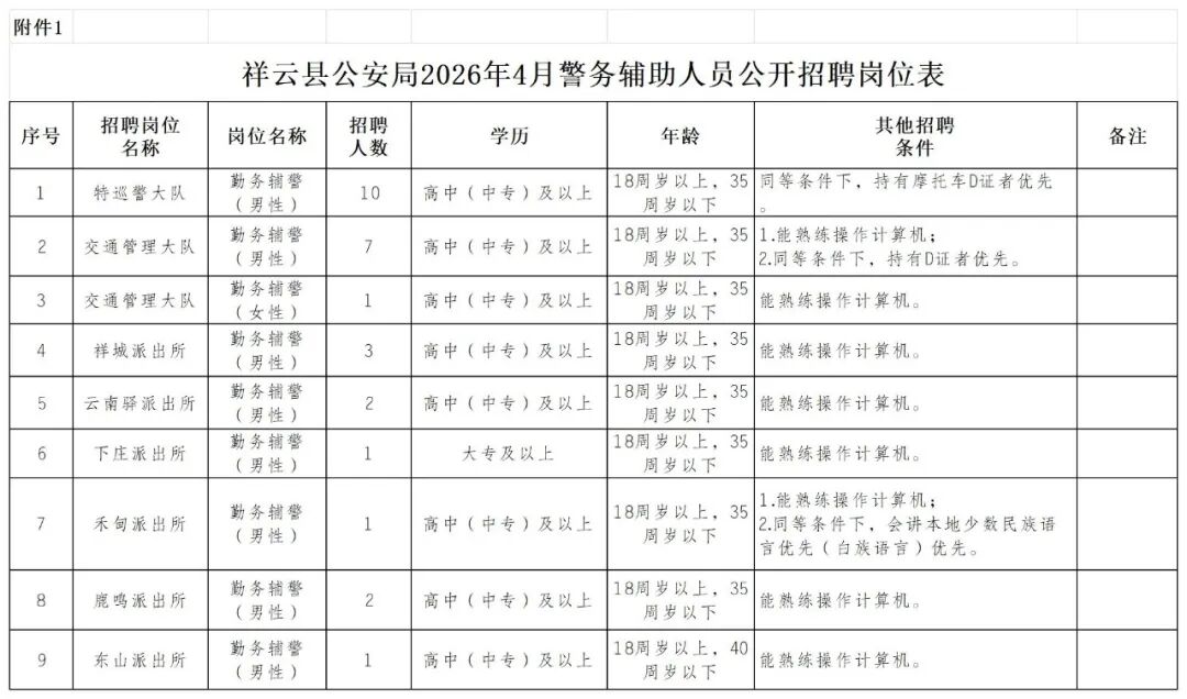 1.祥云縣公安局2026年4月警務(wù)輔助人員公開招聘崗位表