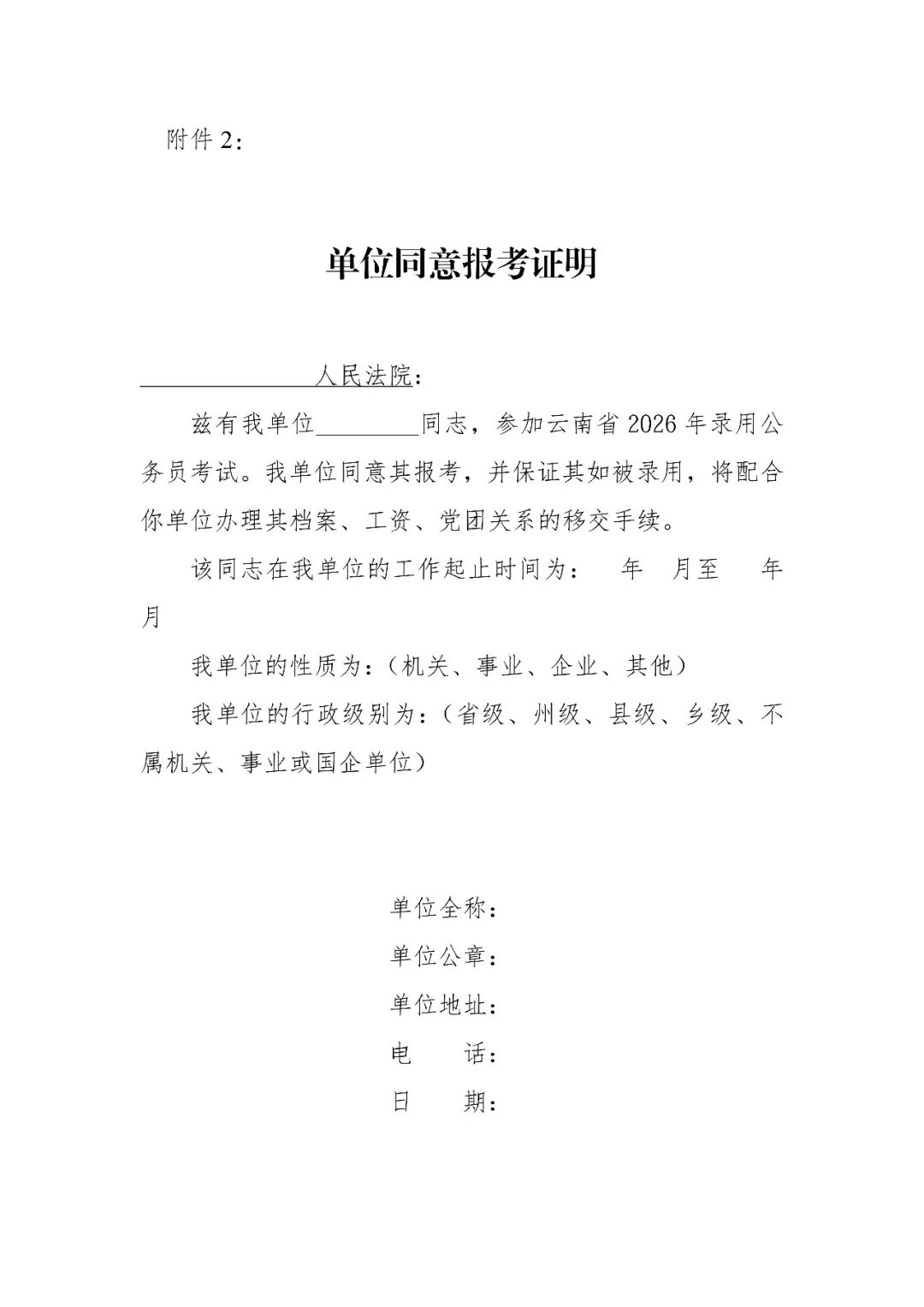 (八)報考職位所需的其他證明材料。請按《云南省2026年度考試錄用公務員公告》、《云南省2026年度考試錄用公務員報考指南》及《云南省2026年度考試錄用公務員招考簡章》等相關要求及報考職位資格條件如實提供。