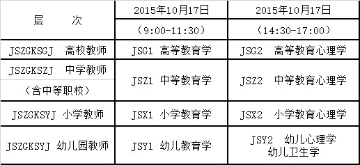 (三)“教師資格考試”設(shè)置的層次和考試科目如下表, 用于“教師資格考試”的考號只能選擇表中所列層次及相應(yīng)課程。具體考試時間安排如下: