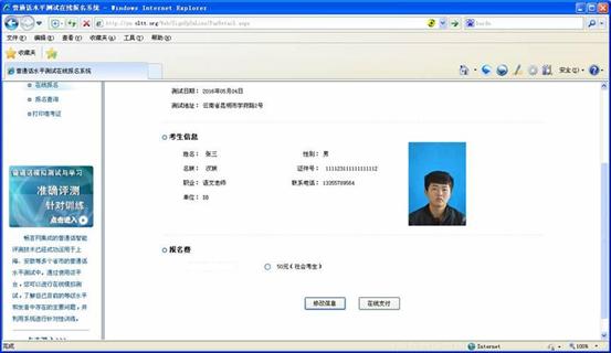 第二步:信息無誤后,點(diǎn)擊上圖中“在線支付”按鈕,進(jìn)行網(wǎng)上繳費(fèi)(網(wǎng)上支付的時限為網(wǎng)上報(bào)名后1個小時內(nèi),超時系統(tǒng)自動取消訂單,考生本次報(bào)名無效)。在線支付目前只支持銀聯(lián)支付方式。