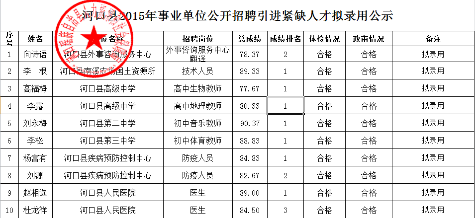 河口縣2015年事業(yè)單位公開招聘引進(jìn)緊缺人才擬錄用人員公示