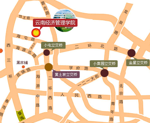 可乘113路、C63路公交車到海屯路中段下車,前行約100米到云南經(jīng)濟管理學院(一號門)