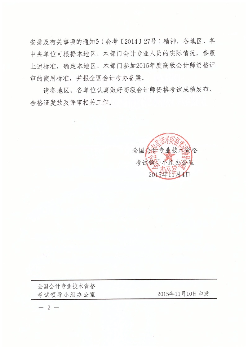 2015年度高級(jí)會(huì)計(jì)師資格考試合格標(biāo)準(zhǔn)通知