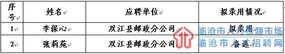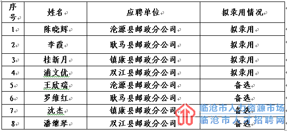 按照“公平、公正、公開”的原則臨滄市郵政分公司員工招聘考試已結(jié)束,經(jīng)紀(jì)檢監(jiān)察審定,現(xiàn)將擬錄用情況進(jìn)行公示如下: