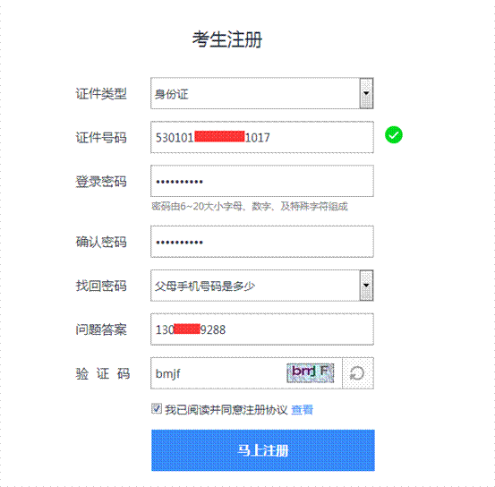 考生憑身份證號(hào)注冊(cè)用戶,用戶名為考生身份證號(hào)。如下圖所示: