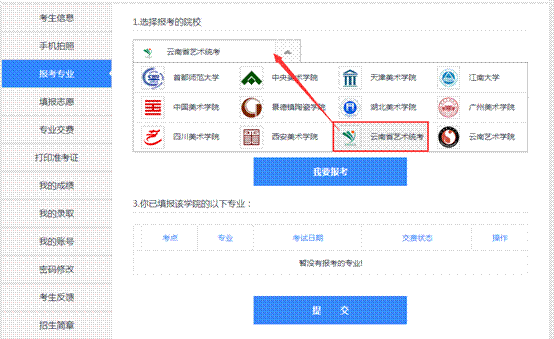 第一步選擇“報(bào)考院校”:省統(tǒng)考選擇“云南省藝術(shù)統(tǒng)考”,非統(tǒng)考(云南藝術(shù)學(xué)院??迹┻x擇“云南藝術(shù)學(xué)院”;