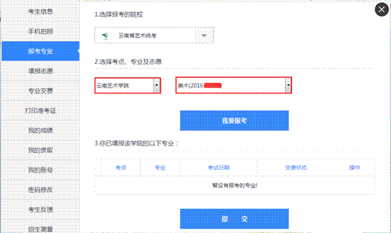 本說(shuō)明所列舉圖片顯示的數(shù)據(jù)(如考生信息、考試時(shí)間、收費(fèi)標(biāo)準(zhǔn)等)均為測(cè)試之用,準(zhǔn)確信息以云南省招生考試院相關(guān)文件規(guī)定、云南藝術(shù)學(xué)院2016年云南省招生簡(jiǎn)章及網(wǎng)上公布的信息為準(zhǔn)。