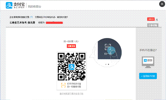 提交成功后進(jìn)入“專業(yè)交費(fèi)”頁(yè)面,點(diǎn)擊“支付”按鈕,系統(tǒng)會(huì)打開支付寶支付頁(yè)面,考生在支付寶平臺(tái)交費(fèi)成功后,調(diào)回到“藝考報(bào)名交費(fèi)平臺(tái)”后會(huì)顯示“支付成功”。
