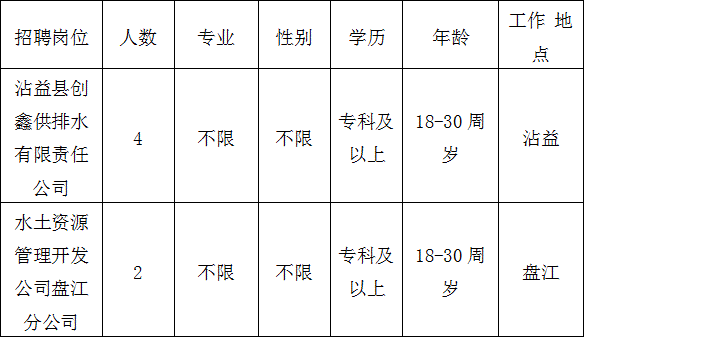 (二)公示期滿無異議的,根據(jù)招聘崗位分別由沾益縣創(chuàng)鑫供排水有限責(zé)任公司、沾益縣水土資源管理開發(fā)公司和擬錄用人員簽訂勞動合同。