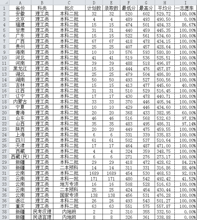 西南林業(yè)大學2015年全國各省份理工類錄取情況表