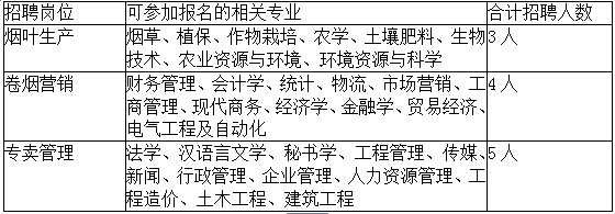 煙葉生產(chǎn)崗位3人、卷煙營銷崗位4人、專賣管理崗位5人,合計招聘12人。