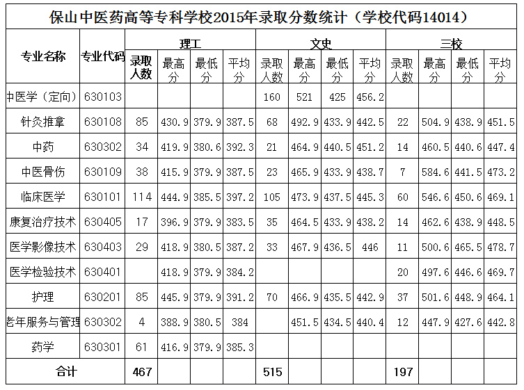 保山中醫(yī)藥高等??茖W(xué)校2015年各專業(yè)錄取情況表
