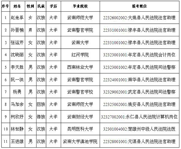 根據(jù)中共云南省委組織部、云南省人力資源和社會保障廳、云南省公務(wù)員局《云南省2016年度考試錄用公務(wù)員公告》等規(guī)定,經(jīng)過筆試、面試、體檢、考察等程序,擬錄用林世靜等11位同志到楚雄州法院系統(tǒng)工作,現(xiàn)予以公示。