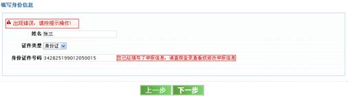 四、未參加全國統(tǒng)考申請人網(wǎng)上報名時填寫完“個人身份信息”后不能進行下一步的操作,并出現(xiàn)錯誤提示,怎么辦?