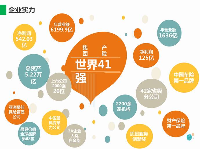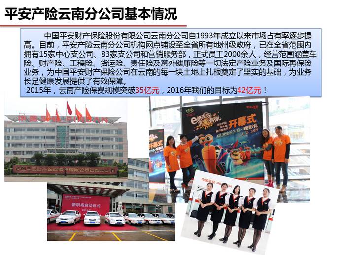 平安產險是中國平安保險集團長期以來經(jīng)營和發(fā)展的基礎,28年來,平安產險業(yè)務規(guī)模逐年攀升,業(yè)務發(fā)展穩(wěn)健。經(jīng)營區(qū)域覆蓋全國,在國內各省市、自治區(qū)設有42家分公司,2100多個營業(yè)網(wǎng)點;此外,還在世界150個國家和地區(qū)的近400個城市設立了查勘代理網(wǎng)點,與中國再保險集團公司、漢諾威再保公司、安聯(lián)再保公司、慕尼黑再保公司、瑞士再保公司等國內外160多家保險公司、再保公司建立了業(yè)務往來。2015年公司整體保費收入突破1600億,已擁有中國第一大車險品牌,是全國第二大財產保險公司。
