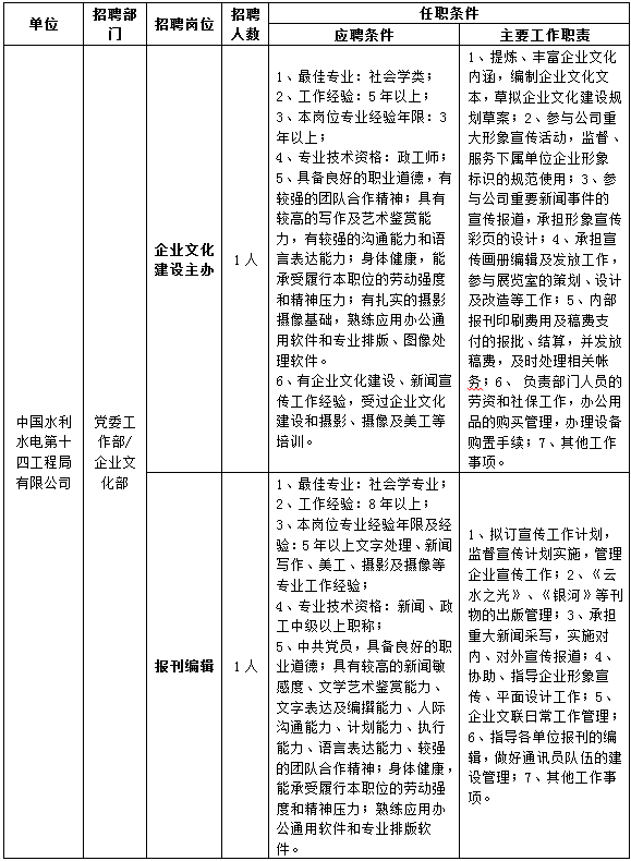 根據(jù)業(yè)務(wù)發(fā)展需要,中國水利水電第十四工程局有限公司現(xiàn)面向社會(huì)誠邀有志于建筑行業(yè)的各界英才加盟,共創(chuàng)美好未來。