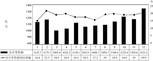 2010年某省社會(huì)消費(fèi)品分月零售額及增幅