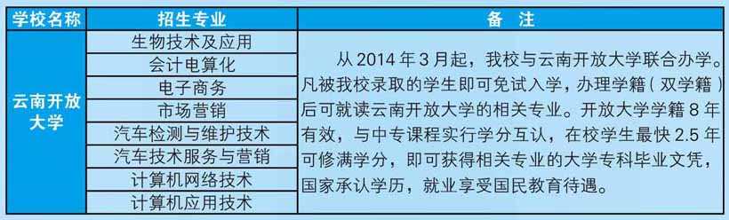 2、云南開放大學(xué):凡欲報(bào)讀開放大學(xué)的學(xué)生,必須先注冊為我校的中職學(xué)籍,方可取得云南開放大學(xué)學(xué)籍。就讀開放大學(xué)的專業(yè)需要與我校中職就讀專業(yè)相同或相近,不得跨專業(yè)報(bào)讀。
