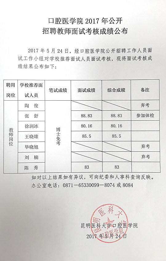 云南省口腔醫(yī)學(xué)院2017年招聘教師面試考試成績公布