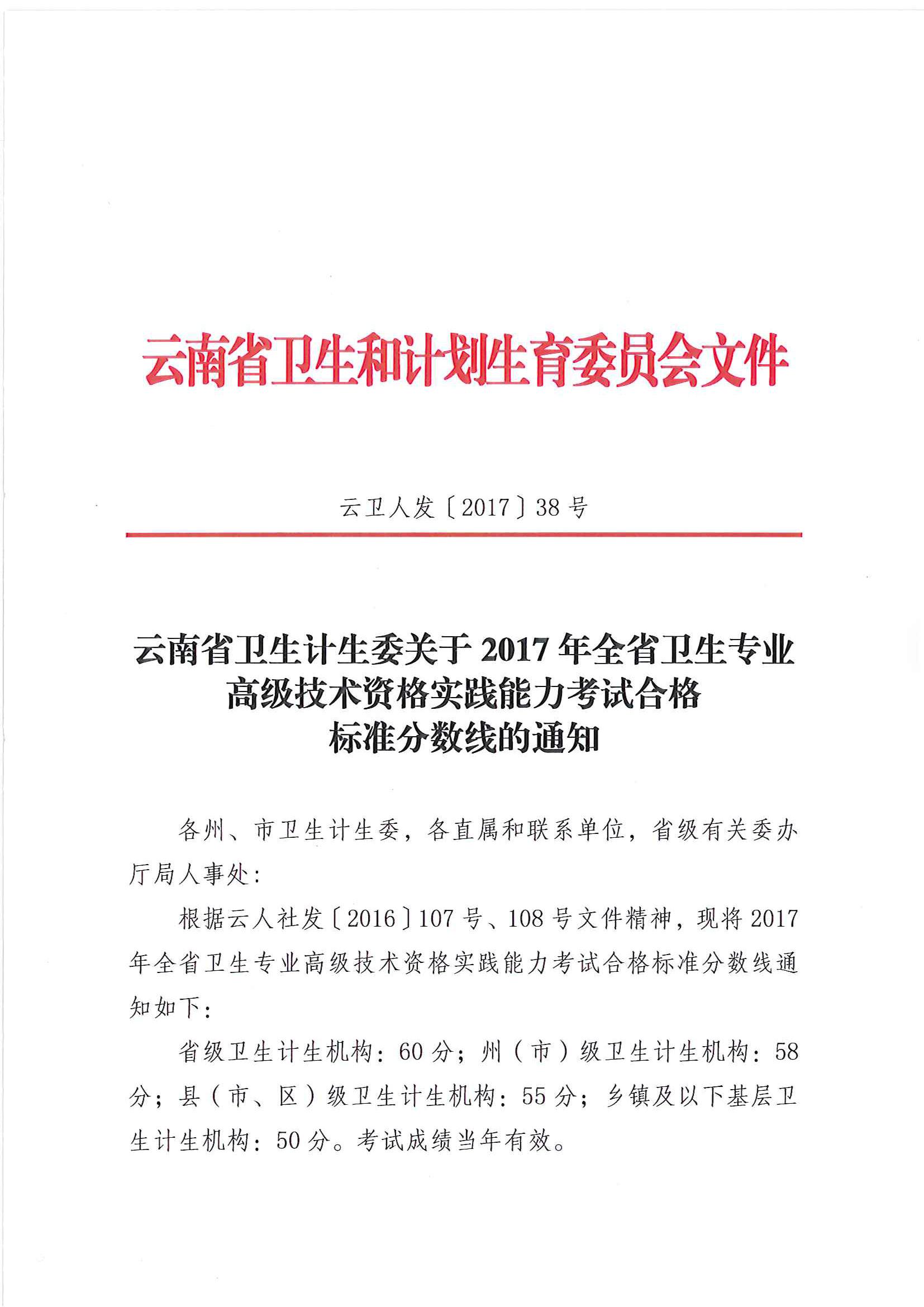 云南省2017年衛(wèi)生專業(yè)高級技術(shù)資格實(shí)踐能力考試合格標(biāo)準(zhǔn)通知