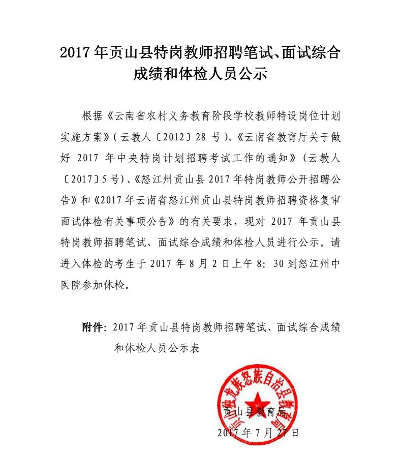 2017年貢山縣特崗教師招聘筆試、面試綜合成績(jī)和體檢人員公示