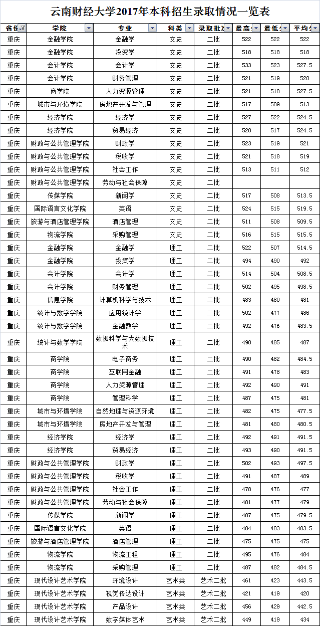 云南財(cái)經(jīng)大學(xué)2017年重慶市錄取情況一覽表