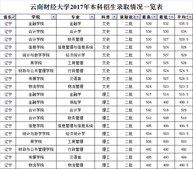 云南財經(jīng)大學(xué)2017年遼寧省錄取情況一覽表
