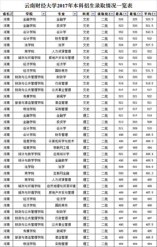 云南財經(jīng)大學(xué)2017年河南省錄取情況一覽表
