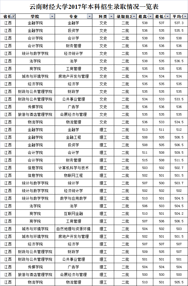 云南財(cái)經(jīng)大學(xué)2017年江西省錄取情況一覽表