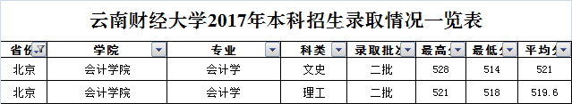 云南財(cái)經(jīng)大學(xué)2017年北京市錄取情況一覽表