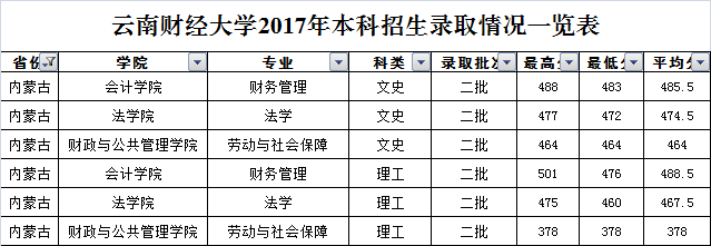 云南財經(jīng)大學2017年內蒙古自治區(qū)錄取情況一覽表