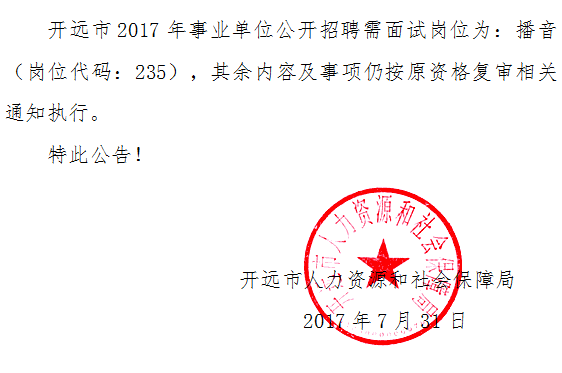 紅河州開遠市2017年事業(yè)單位招聘面試崗位更正公告