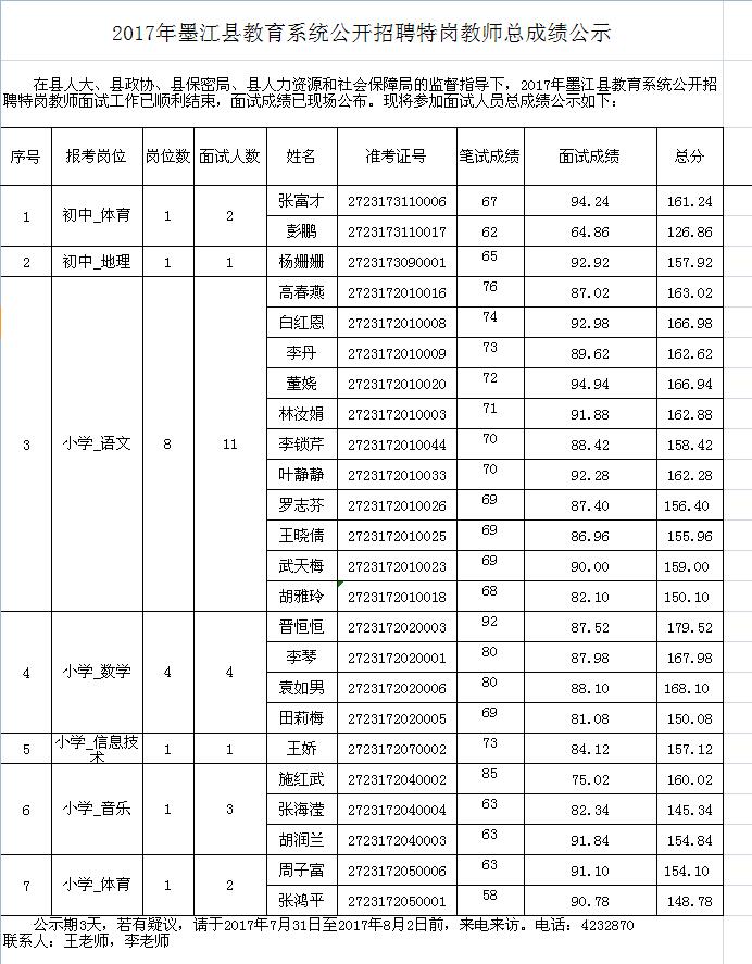 2017年墨江縣教育系統(tǒng)公開(kāi)招聘特崗教師總成績(jī)公示