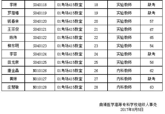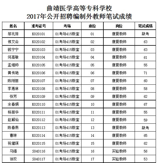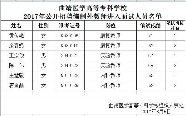 根據(jù)《曲靖醫(yī)學(xué)高等??茖W(xué)校2017年公開招聘編制外教師公告》筆試工作已結(jié)束?,F(xiàn)將筆試成績(jī)及進(jìn)入面試人員名單公布如下: