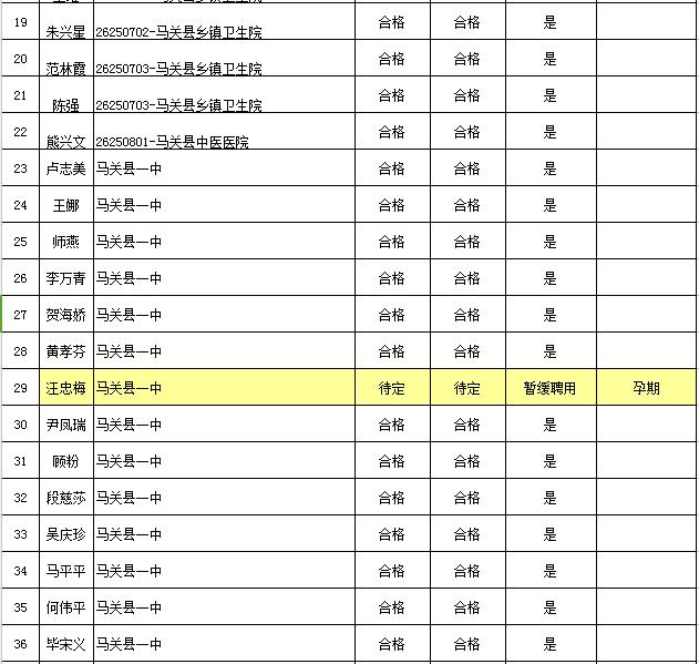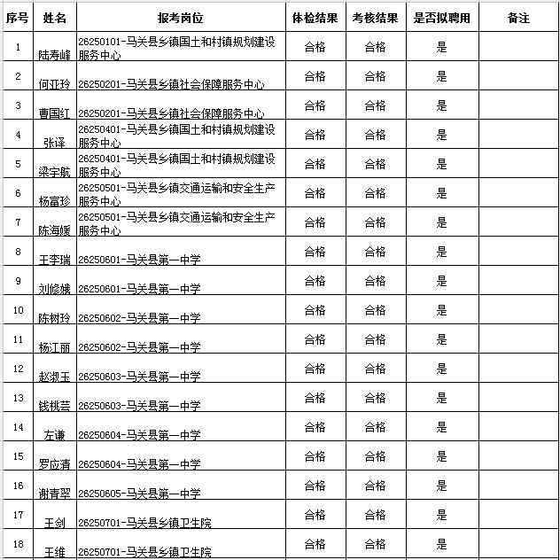 根據(jù)《2017年文山州事業(yè)單位公開招聘工作人員公告》《馬關(guān)縣2017年度事業(yè)單位公開招聘緊缺人才公告》的規(guī)定,現(xiàn)將2017年馬關(guān)縣事業(yè)單位公開招聘、緊缺人才招聘體檢、考核結(jié)果及擬聘用人員名單公告如下,公示期5天。公示期內(nèi),若對(duì)擬聘用人員有異議的,請(qǐng)攜帶本人身份證和投訴舉報(bào)書面材料向馬關(guān)縣紀(jì)委監(jiān)察局(電話:0876-7122342)進(jìn)行現(xiàn)場(chǎng)實(shí)名制舉報(bào)(不受理電話舉報(bào)和網(wǎng)絡(luò)舉報(bào)),逾期不予受理。對(duì)被舉報(bào)人員進(jìn)行復(fù)核不符合條件和資格的,取消聘用資格。