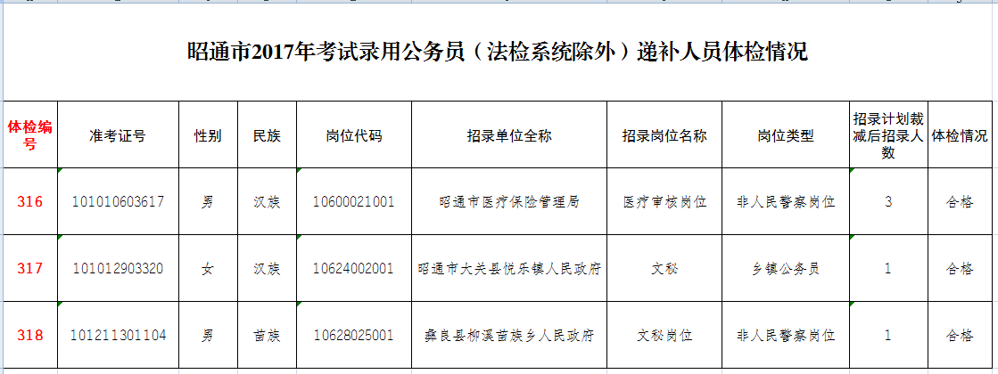 昭通市2017年考試錄用公務(wù)員(非法檢)遞補(bǔ)人員體檢情況