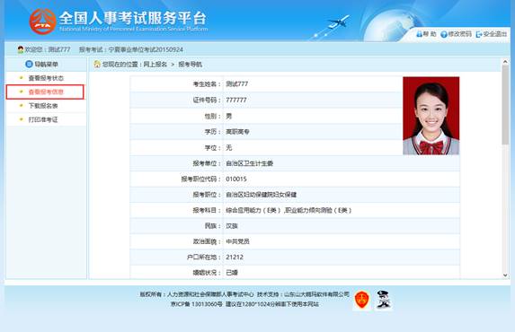 考生可以通過點(diǎn)擊“查看報(bào)考信息”按鈕,查看考生填寫的報(bào)考信息,如下圖所示: