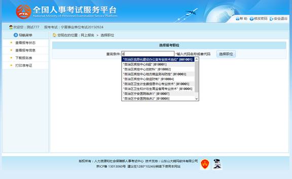 通過點(diǎn)擊“選擇職位”選項(xiàng),可以跳轉(zhuǎn)到選擇報(bào)考職位界面,如下圖所示: