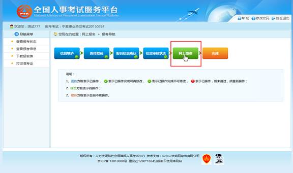 審核通過的考生可以進(jìn)行網(wǎng)上繳費(fèi),點(diǎn)擊報(bào)考流程中“網(wǎng)上繳費(fèi)”選項(xiàng),可以進(jìn)