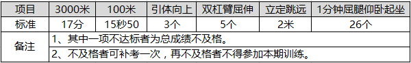 根據(jù)民航局要求,男生在取得安全員執(zhí)照前須參加民航局組織的安全員初始訓(xùn)練考核,體能考核項目及標(biāo)準(zhǔn)為: