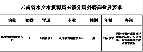 根據(jù)玉溪水文事業(yè)發(fā)展需要,我單位面向社會公開招聘2名編制外工作人員,具體崗位和要求如下: