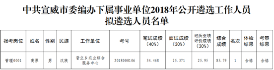根據(jù)《中共宣威市委辦公室 宣威市人民政府辦公室關(guān)于印發(fā)<宣威市市屬事業(yè)單位公開遴選工作人員實施辦法 (試行)〉的通知》(宣辦發(fā)〔2017〕115號)規(guī)定,按照《中共宣威市委編辦下屬事業(yè)單位2018年公開遴選工作人員公告》的程序安排,本次遴選筆試、面試、經(jīng)歷業(yè)績評價、體檢和組織考察工作已經(jīng)結(jié)束,現(xiàn)將擬遴選人員公示如下,公示期為7天(2018年5月10日至2018年5月16日)。