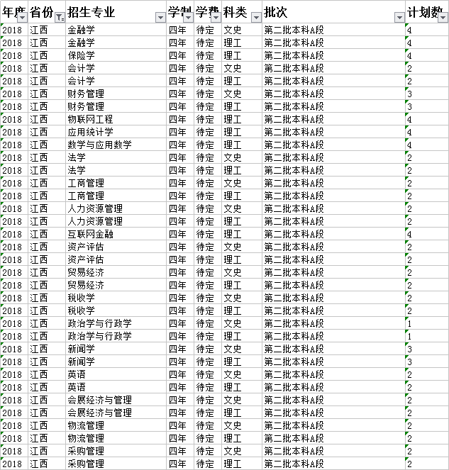 云南財經(jīng)大學2018年本科分省招生計劃表(江西)