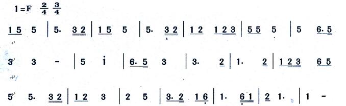 35.在答題卷上重寫下列曲譜,按指定拍號畫出小節(jié),并按音樂旋律進行加以正確的節(jié)奏組合。