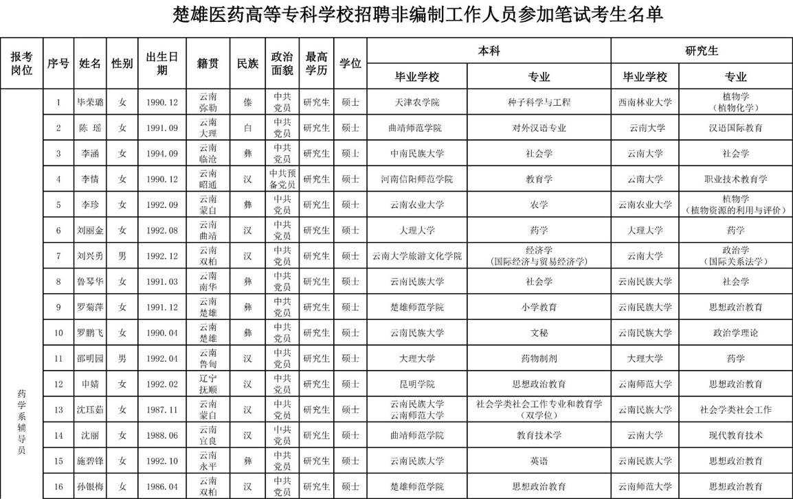 附件:1、楚雄醫(yī)藥高等??茖W(xué)校2018年公開招聘非編制工作人員筆試考生名單;