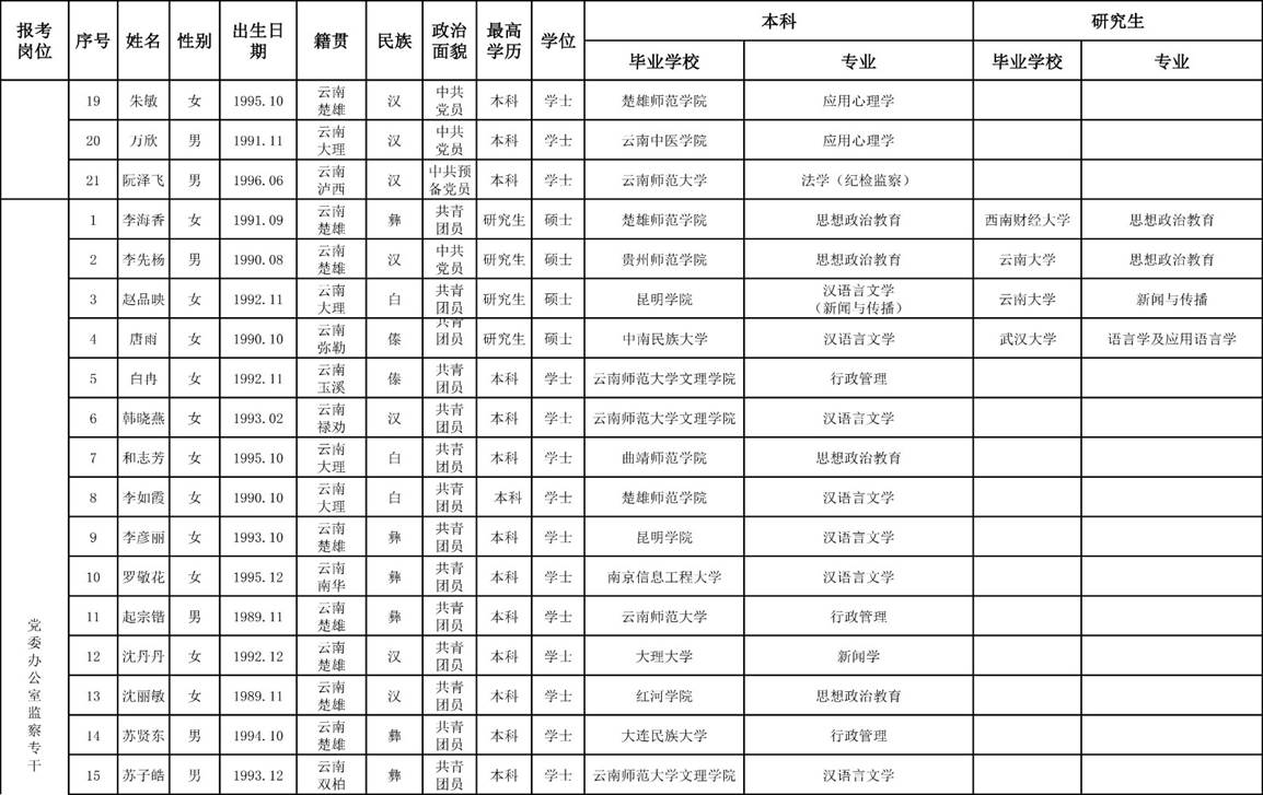 1、需要筆試崗位及人員:藥學(xué)系輔導(dǎo)員、醫(yī)學(xué)系輔導(dǎo)員、護(hù)理學(xué)院輔導(dǎo)員、系部專職組織員、組織人事處專職組織員、黨委辦公室監(jiān)察專干、學(xué)生工作處保衛(wèi)科干事七個(gè)崗位符合報(bào)名條件的人數(shù)超過10人,按《楚雄醫(yī)藥高等專科學(xué)校2018年公開招聘非編制工作人員公告》規(guī)定,需先筆試后面試。(筆試人員名單附后)