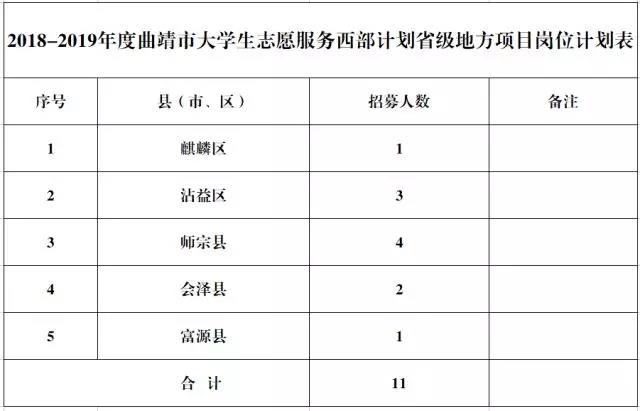 曲靖市西部計(jì)劃項(xiàng)目辦根據(jù)云南省大學(xué)生志愿服務(wù)西部計(jì)劃項(xiàng)目管理辦公室下發(fā)的《關(guān)于開展2018-2019年度云南省大學(xué)生志愿服務(wù)西部計(jì)劃省級地方項(xiàng)目的通知》(云志項(xiàng)辦通〔2018〕4號)文件要求,為嚴(yán)格做好大學(xué)生志愿服務(wù)西部計(jì)劃招募、選拔、崗位申報(bào)和考核鑒定等工作,結(jié)合曲靖市2018-2019年度云南省大學(xué)生志愿服務(wù)西部計(jì)劃地方項(xiàng)目實(shí)施規(guī)模和延期志愿者人數(shù)實(shí)際,曲靖市擬新招大學(xué)生西部計(jì)劃省級地方項(xiàng)目志愿者共11名。相關(guān)事宜如下: