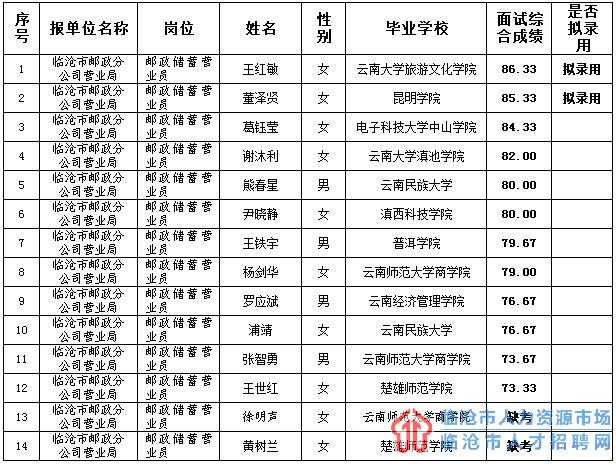 根據(jù)“公平、公正、公開”的原則,中國郵政集團(tuán)公司臨滄市分公司接收見習(xí)人員考試已結(jié)束,經(jīng)紀(jì)檢監(jiān)察審定,現(xiàn)將招聘崗位面試綜合成績公告如下: