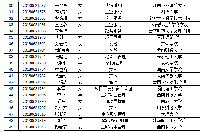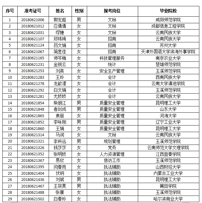 根據(jù)《玉溪高新區(qū)融建集團投資有限公司2018年公開招聘工作人員公告》有關(guān)規(guī)定,經(jīng)報名、資格審查、考試、體檢、政審合格,確定擬聘用人員,現(xiàn)公示如下: